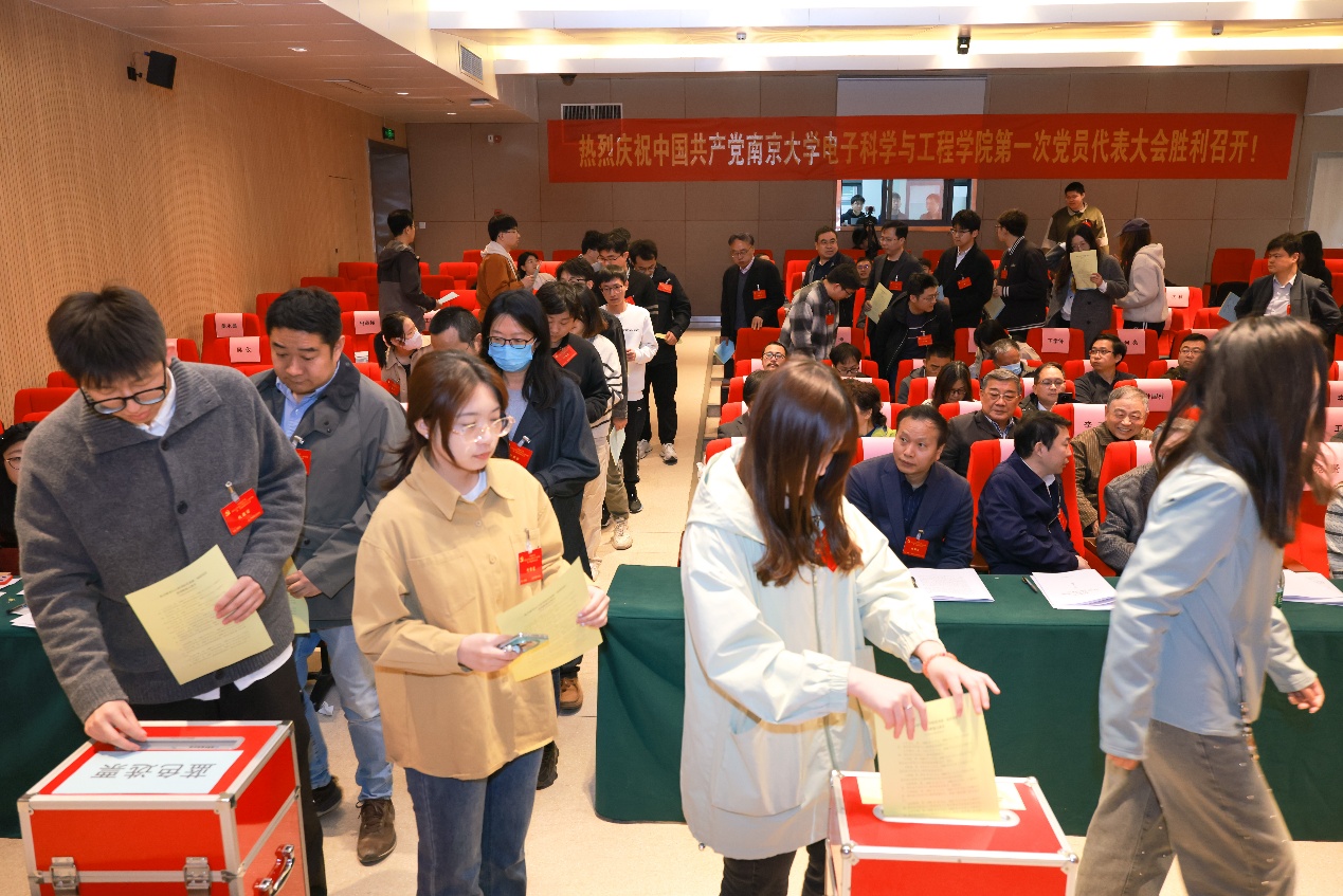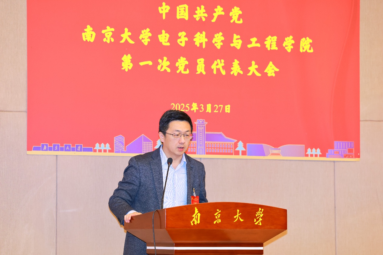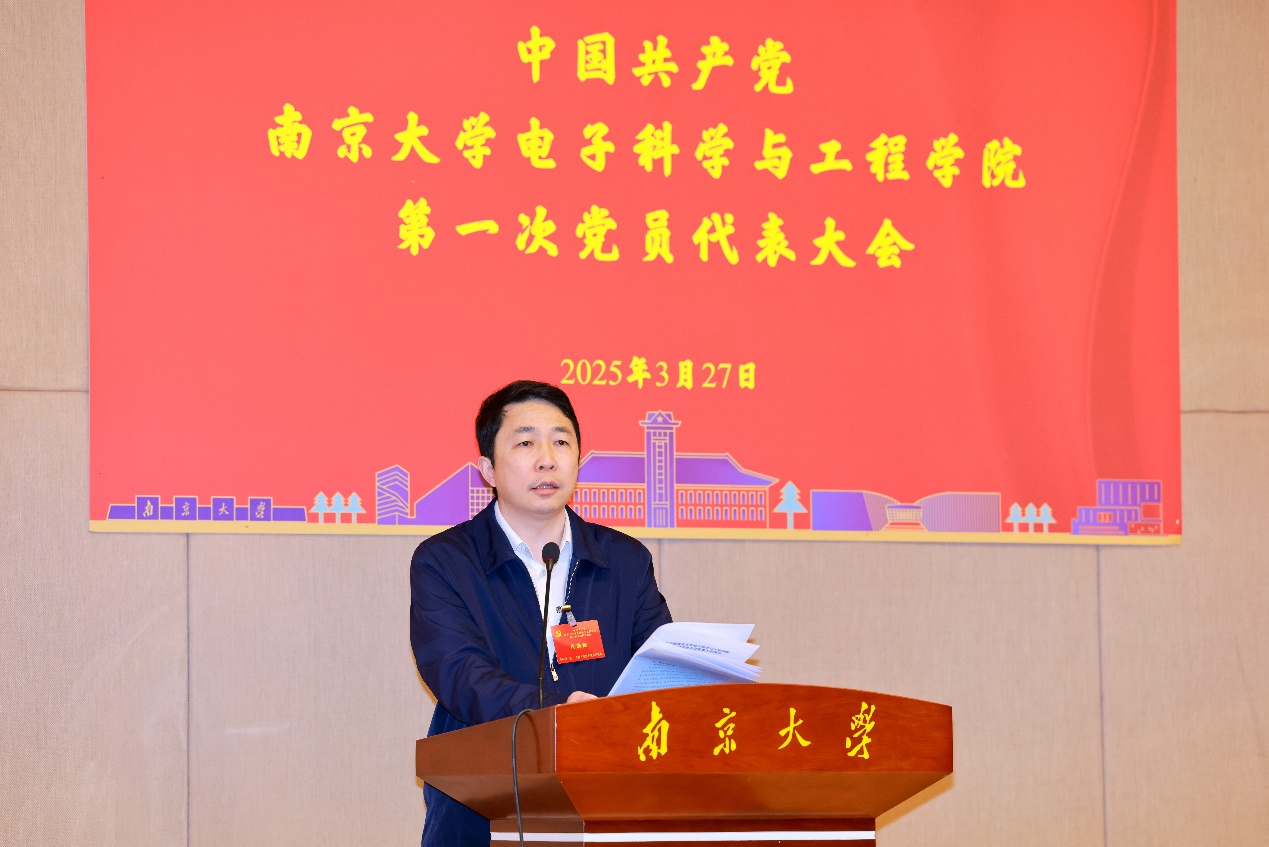 2025年3月27日,中国共产党在线赌场-线上赌场娱乐城 第一次党员代表大会在南京大学电子楼报告厅隆重举行。学校党委组织部副部长范赟到会指导,中国科学院院士吴培亨等109名党代表齐聚一堂,共同擘画学院发展蓝图。学院党委副书记孔令红主持会议。