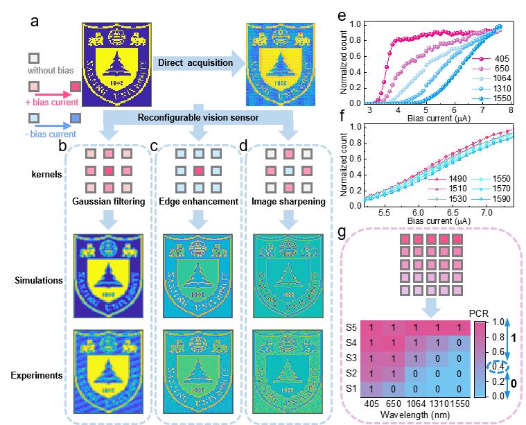 进一步的,研究人员基于可调控的光计数率实现了片上图像预处理功能,包括高斯滤波、边缘增强和图像锐化。如图4(b-d)所示,实验结果和仿真结果高度一致,与图4(a)中直接采集的图像相比,边缘增强和图像锐化操作都避免了分块采集导致的块状响应。此外,SNSPD具备本征的光谱分辨能力,如图4(e-f)所示,不同波长入射光对应的计数率曲线不同。如图4(g)所示,通过优化偏置电流矩阵,仅需单次采集即可实现入射光波长的分辨。