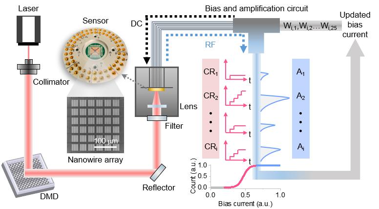 凭借单光子灵敏度和极低暗计数,超导纳米线单光子探测器(SNSPD)在可见光到红外波段都得到了广泛的应用。然而随着像元数目的增加,低温下逐像元的信号读出将面临挑战。目前的阵列SNSPD读出方案,如行列复用、时分复用等,普遍存在读出效率低、数据量大的问题,难以胜任实时的成像与目标识别任务。突破探测-存储-计算的传统路径而使用感算一体的架构,是基于阵列SNSPD实现高光子利用效率的单光子相机的可行路径之一。