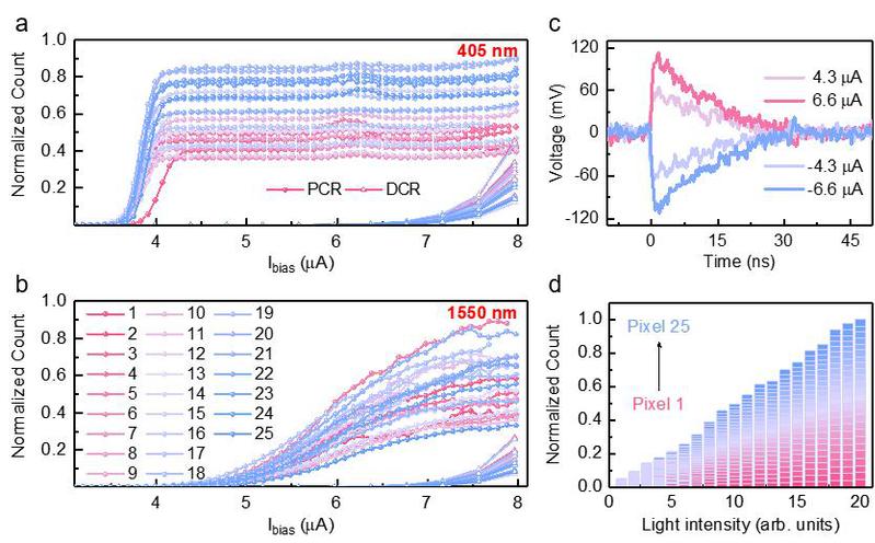 图2 阵列SNSPD的可调控光响应特性。(a)405 nm下光计数率随偏置电流的变化曲线;(b)1550 nm下光计数率随偏置电流的变化曲线;(c)响应脉冲幅值随偏置电流的变化;(d)光计数率随光强的变化曲线。