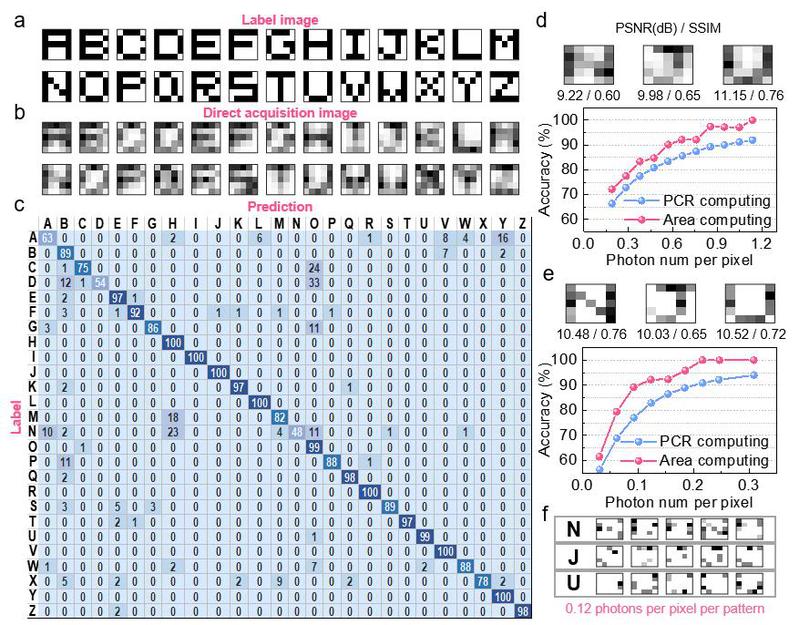 结合上述两种计算方案,研究人员基于该相机实现了26字母图案的分类。如图3(a-c)所示,尽管DMD串扰和背景噪声导致投影图案的质量较差,该技术对大部分字母的分类准确率仍可达到95%以上。图3(d-e)展示了针对“NJU”字母三分类进一步分析的结果,在剔除外部光路导致的串扰后,平均每像素采集0.12个光子,字母三分类的准确率即可达到90%以上。如图3(f)所示,平均每像素采集0.12光子得到的字母图案几乎无法通过肉眼分辨,而感算一体超导单光子相机仍然可以基于局部的特征进行准确的分类。